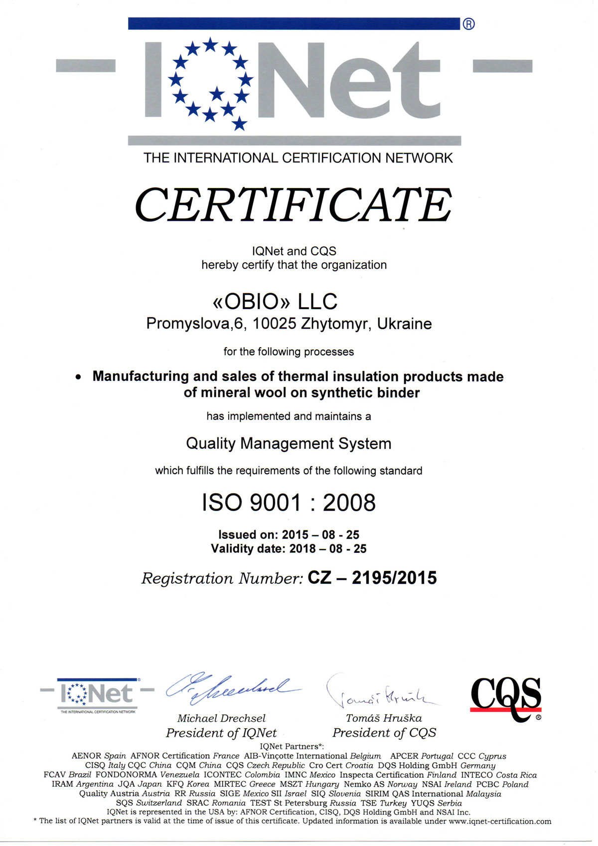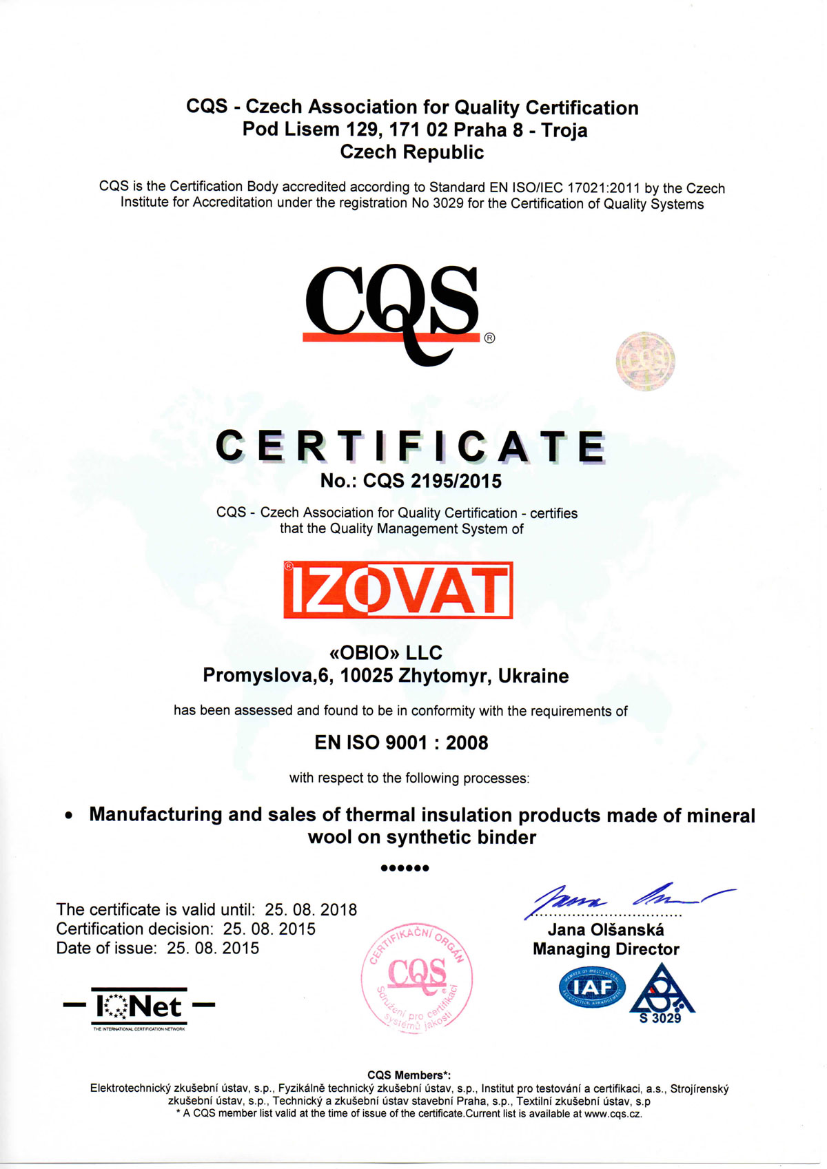 certyfikat EURO EN 1CQS 9001 enIQNET 9001 quality management system