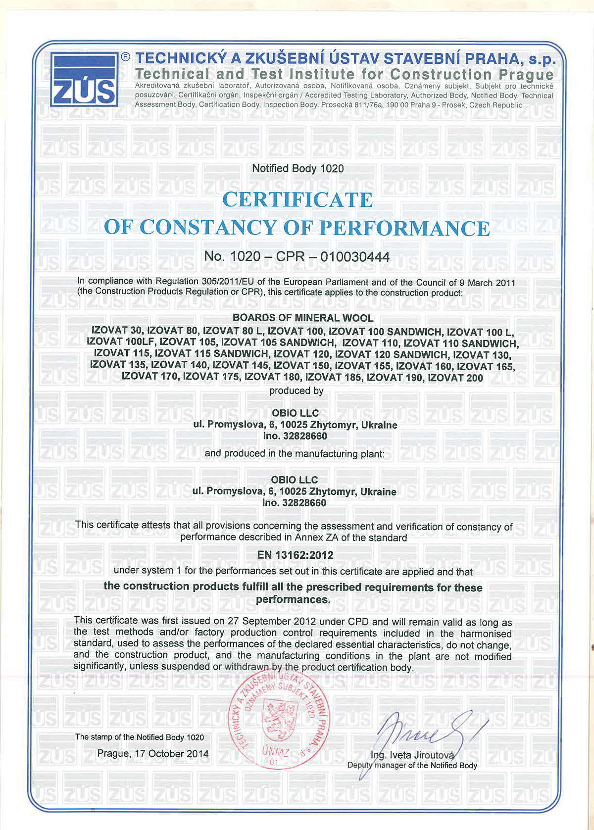 Ognioodporne izolacje termiczne IZOVAT,  produkowane w Żytomierskim Zakładzie Materiałów Izolacyjnych, to materiały ze skalnej wełny mineralnej, izovat1niepalna izolacja termiczna, do produkcji której  wykorzystywane są  bazaltowe płyty izolacyjne o gęstości pozornej 30 - 200 kg/m3 oraz wymiarach w zakresie: